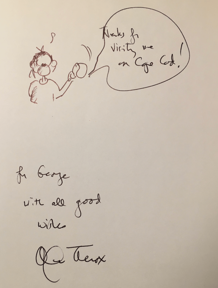 Alexander Theroux’s inscription to George Salis after a visit to Theroux’s home in Cape Cod. (10/4/22)