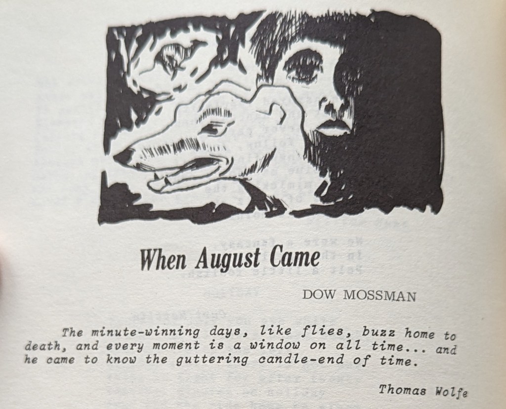 DM: No, it’s not Xeroxing. I did it with a printer down in Muscatine. I’ll never forget it because I had mono. It was the senior workshop fiction magazine they put out that year. I wound up editing it or at least working it through the press. [It’s a 120-page book from the Iowa Writers Workshop titled Le Beau Petard: An anthology of prose and poetry from the younger writers of the Iowa Workshops (1966), and Dow Mossman is listed as an executive editor. It also features an early section of The Stones of Summer with the title “When August Came.” The excerpt includes an epigraph from Thomas Wolfe: “The minute-winning days, like flies, buzz home to death, and every moment is a window on all time…and he came to know the guttering candle-end of time.”] But uh, photo, photo…I don’t know, anyway. The Barnes & Noble one was just a mess, a total mess. (laughs) I read it and I did a yellow page. I got a yellow legal pad and I sent it to them. I don’t think the pattern…they had it straightened, I don’t know, that was just the way it worked. It came out good, but…and they let me add a couple…. I had [the character] Barney read his letter from Vietnam [three poems and letters from Vietnam used by permission of D. Braun Guenther]. His letter was added because I hooked up with him again about that time and I thought that, hell, I don’t know. I didn’t reread part three after.